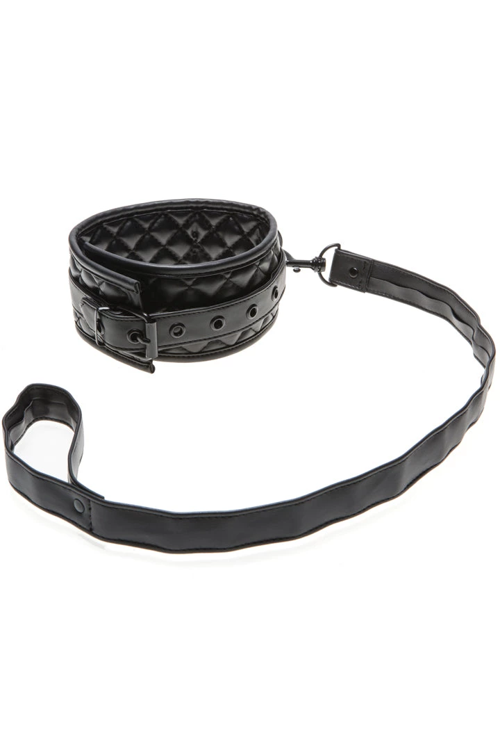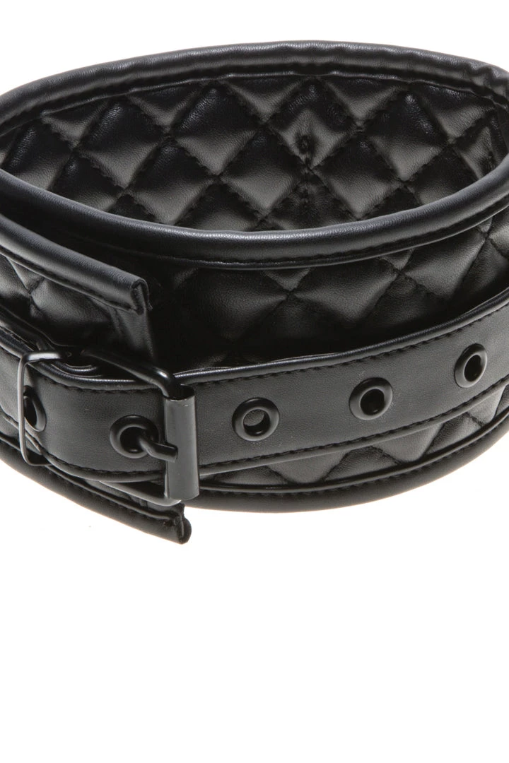 Relinquish your power to your Master in this Quilted Faux Leather Collar & Leash. This erotic bondage collar and leash is composed premier soft faux leather material with quilted pattern, and designed as a thick collar with an attached faux leather leash. Intended to keep you on a short leash, your Master will enjoy breaking you in.