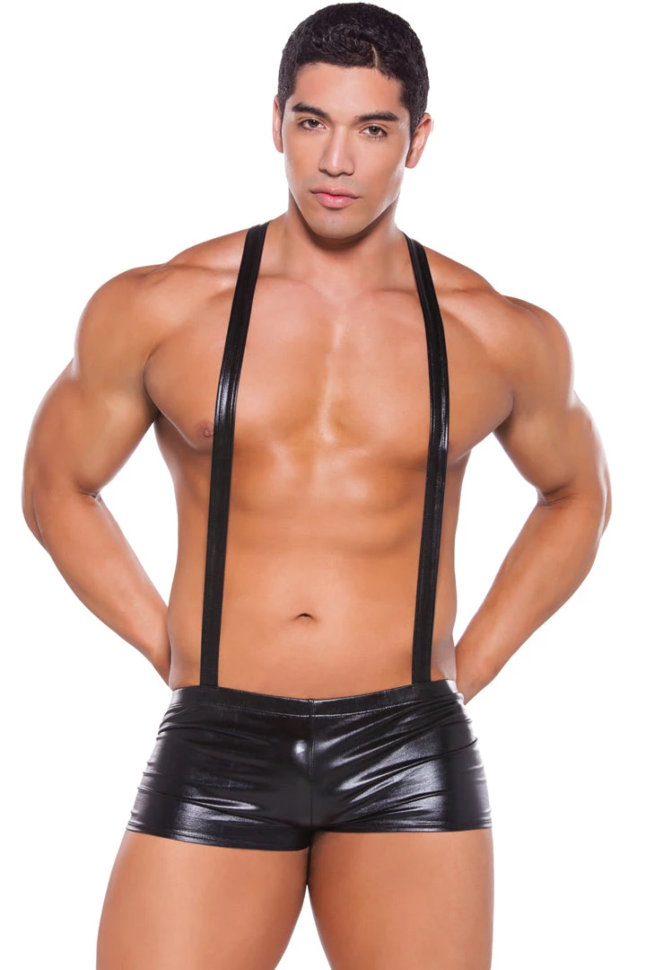 Create a playful touch with these Men’s Wet Look Suspender Shorts that features snug and sexy wet look shorts with suspenders. Full wet look back.