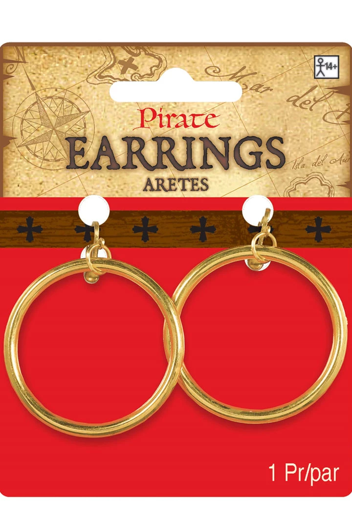 Accessorize your DIY pirate costume with these Earrings Pirate Hoops that feature faux gold plated hoops that dangle from spring ear-backings.