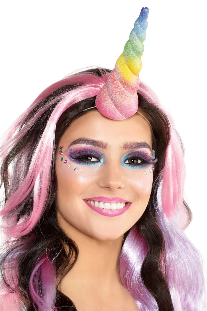 Make your DIY unicorn costume a sensation with this Rainbow Sparkle Unicorn Horn Costume Accessory! This lightweight accessory features a foam unicorn horn covered in multi-colors with no-mess glitter and an attached elastic band for a secure and comfortable fit. *Wig and accessories sold separately.