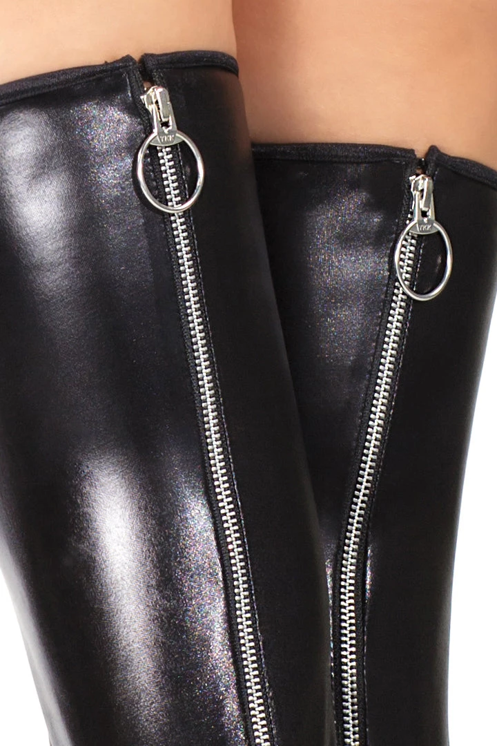 Addicted to racy intentions, these Faux Leather Thigh Highs with Back Zippers are here to fulfill your desires. This pair of wet look thigh high stockings features a glossy sheen material creating a ‘wet look’ appeal. Includes a contrasting mesh foot with functioning back zippers. Built for the inner dominatrix, wear these erotic thigh highs as a sexy costume accessory or dominatrix outfit.