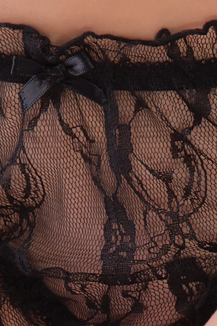 This Ruffled Trim Floral Mesh Panty features a naughty innocence including a sheer ruffled front with closed crotch, ruched back, and large black satin bow in rear.