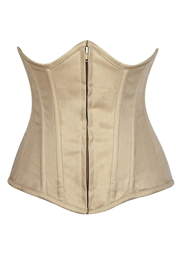 Wear this Lavish Beige Cotton Underbust Corset under any clothing and transform your look from drab to fab. This underbust corset is made of comfortable and breathable cotton. It is tailored with a premium hidden front closure with color matched zipper. Along with a privacy panel, it has sturdy nickel brass grommets with thick cords and matching laces at the back for tight waist cinching. It is equipped with premium garter loops. For Dry Clean Only.