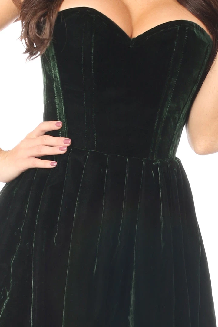 This Steel Boned Green Velvet Empire Waist Corset Dress is a must-have for your romantic dates and special occasions. This deep emerald, sweetheart neckline corset dress is made of premium quality velvet fabric. With a hidden side zipper closure, the corset continues down under the dress for that seamless and slimmed down silhouette. Ties are found at the back so you can adjust the tightness to your liking. Dry Clean Only.