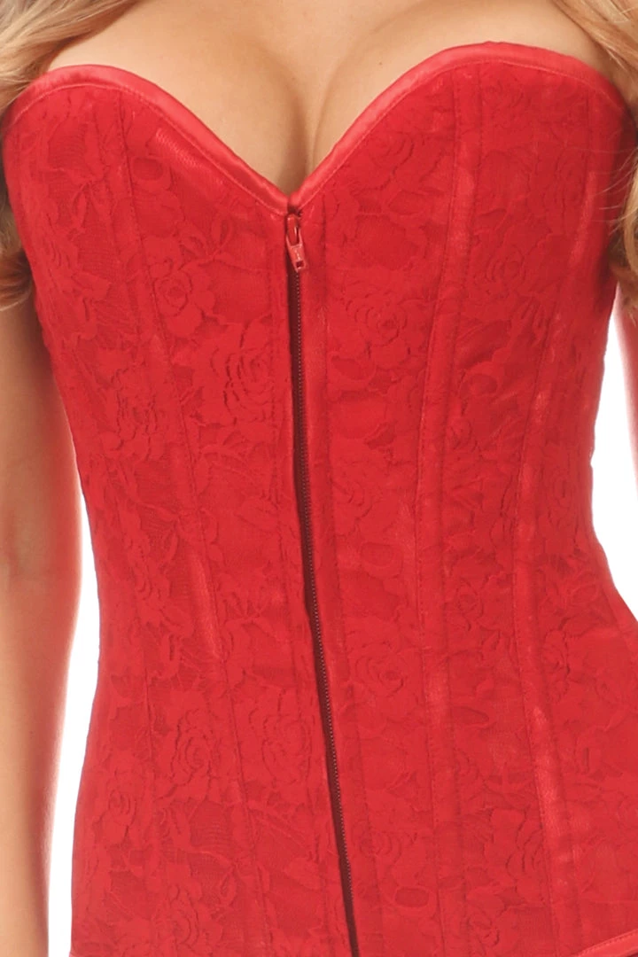 With its eye-catching crimson fabric, the Lavish Red Lace Overbust Corset will always be a standout amongst a sea of black and white lingerie. It is a full bust corset made of high quality satin with lace net overlay and durable front zipper closure. It has 10 plastic bones with 4 static steel back bones. It has sturdy nickel brass grommets with thick cords for tight waist cinching. It is equipped with removable garters. For Dry Clean Only.