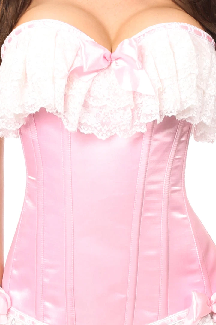 Be pretty in pink with this Lavish Pink Burlesque Corset w/Lace and be the epitome of femme fatale. This full bust corset is made of luxury satin fabric trimmed with soft white lace. It is manufactured with 10 plastic bones and 4 static steel back bones. Along with a privacy panel at the back, it has sturdy nickel brass grommets with thick cords for tight waist cinching. It is equipped with premium garter loops. For Dry Clean Only.