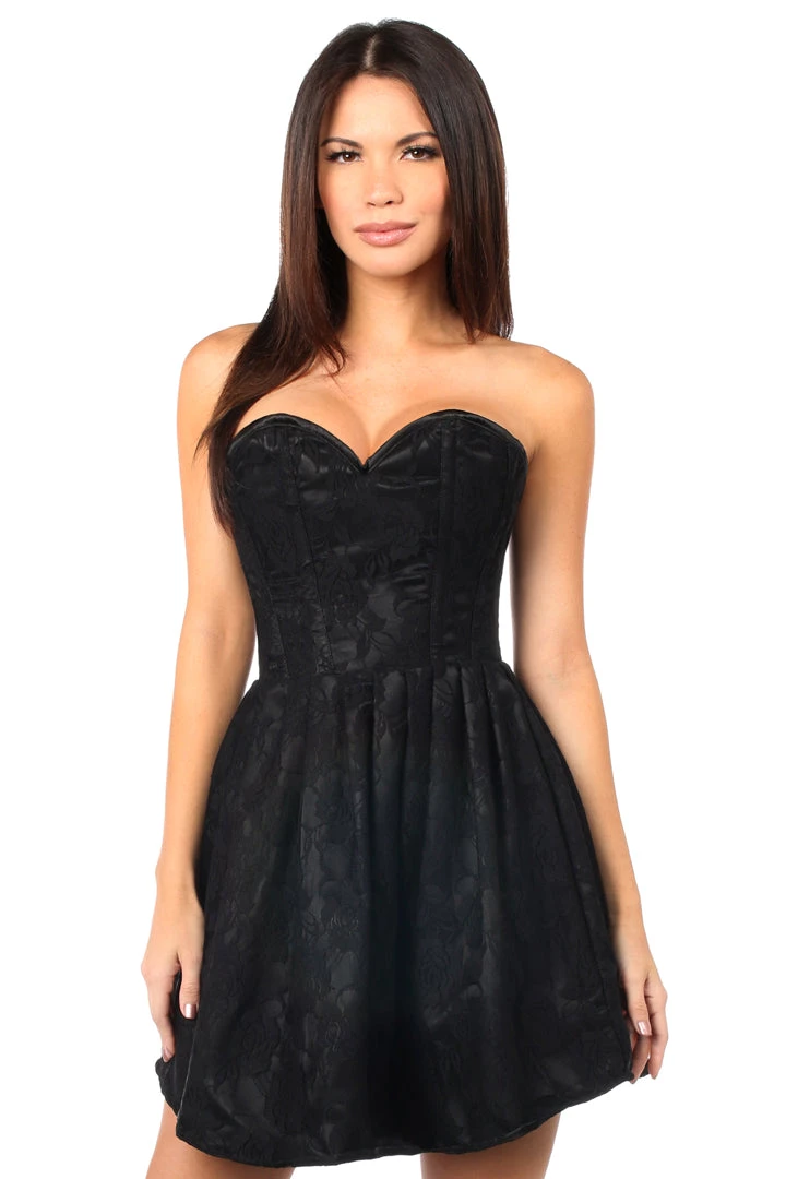 If you are looking for the quintessential little black dress then all you need is this Steel Boned Black Lace Empire Waist Corset Dress. This black sweetheart neckline corset dress is made of premium quality satin and lace. With a hidden side zipper closure, the corset continues down under the dress for that seamless and slimmed down silhouette. Ties are found at the back so you can adjust the tightness to your liking. Dry Clean Only.