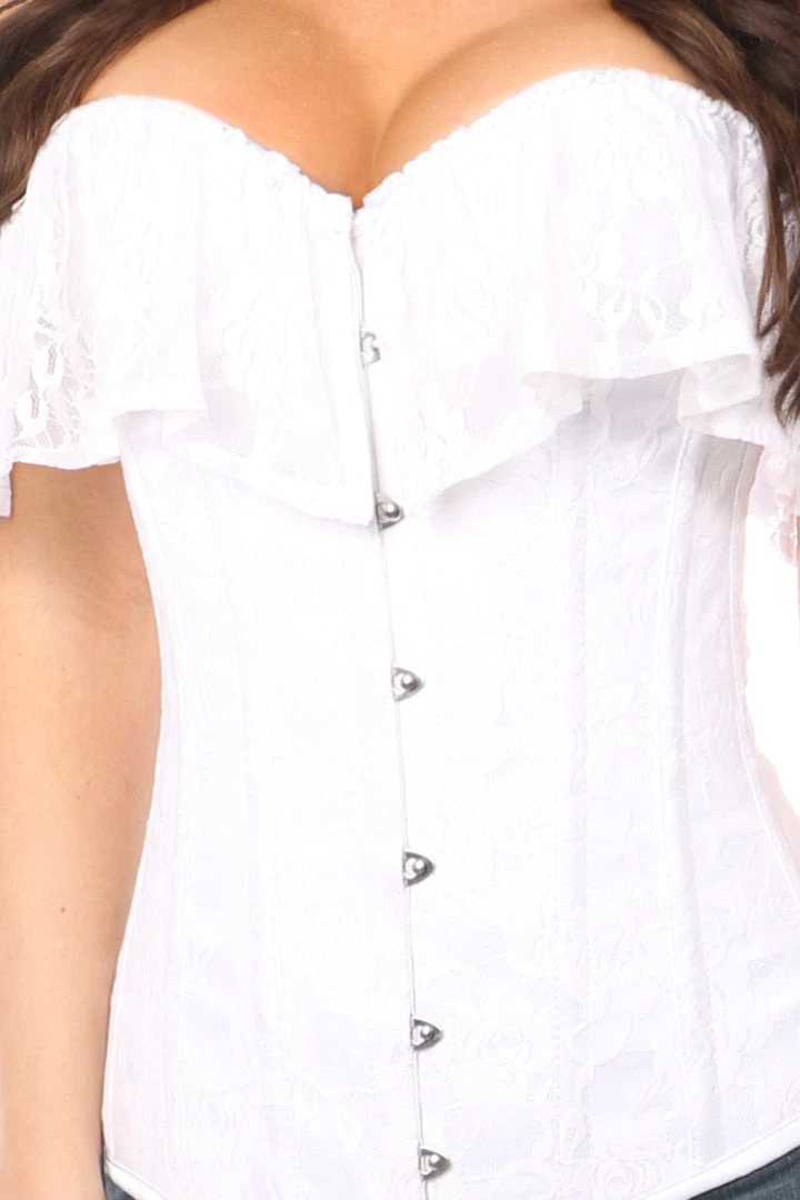 We are absolutely head over heels with this Lavish Blue Lace Off-The-Shoulder Corset. It is a full bust corset made of exquisite satin veiled with a delicate lace net overlay. It features a remarkably flattering elastic lace off-the-shoulder sleeves. It has premium front busk closure with 10 acrylic bones and 4 static steel back bones. Along with a privacy panel at the back, it has sturdy nickel brass grommets with thick cords for tight waist cinching. It is equipped with premium garter loops. For Dry Clean Only.