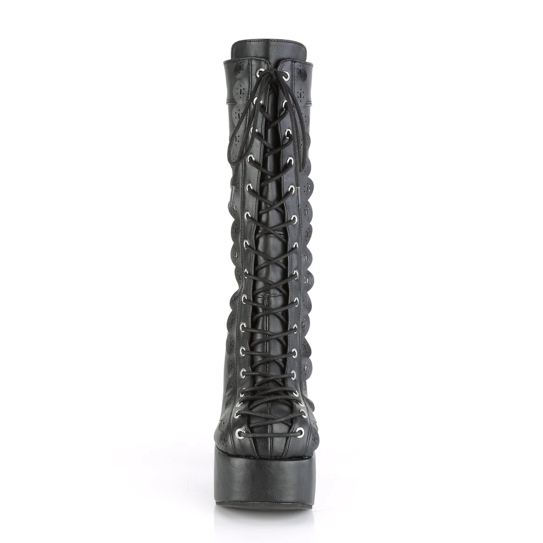 Be bold with these black vegan leather platform boots with a 4 1/2″ (114mm) Block Heel, 2″ (51mm) Platform Mid-Calf Boot Featuring Perforated Scallop Trim Design and Back Zip Closure.