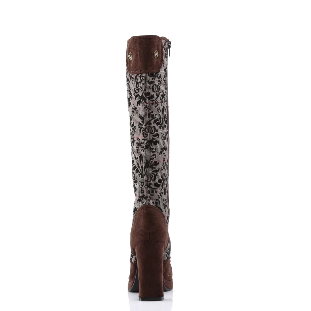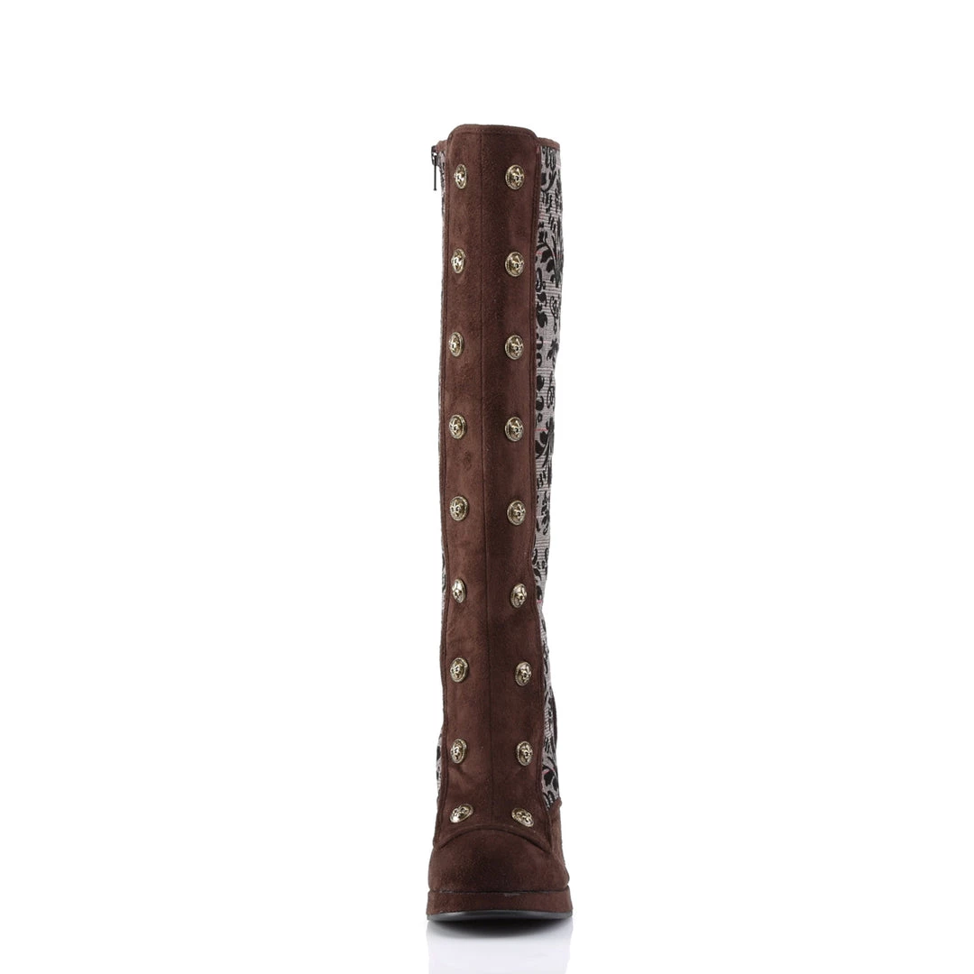 A blend of Victorian air and science fiction, these platform boots include 4″ (10.2cm) Heel, 3/4″ (1.9cm) Platform Steampunk Victorian Knee Boot, Full Inner Size Zipper