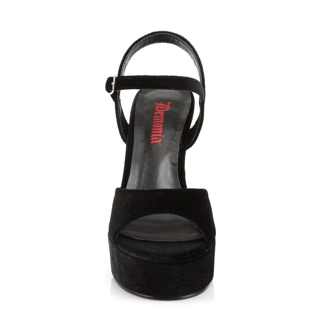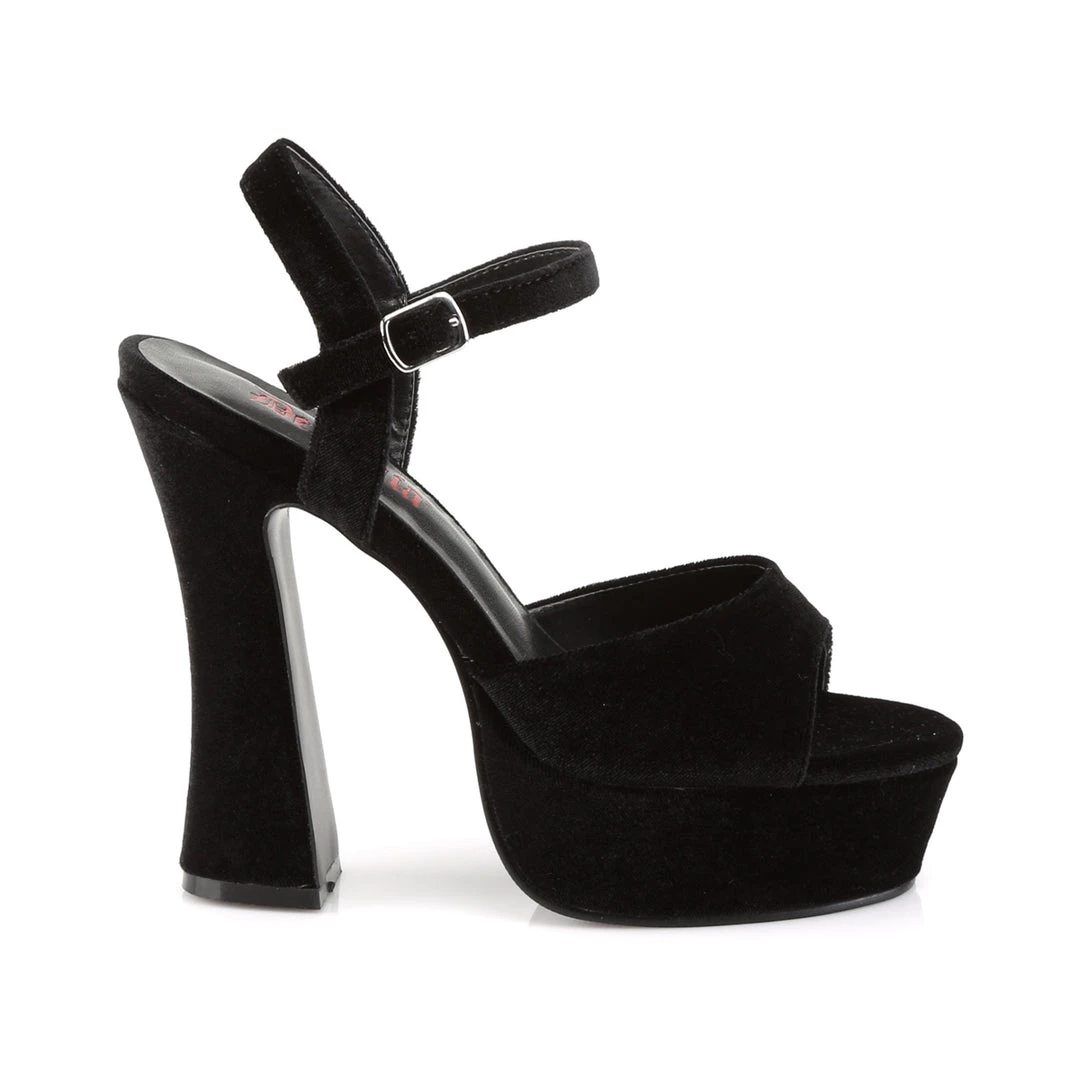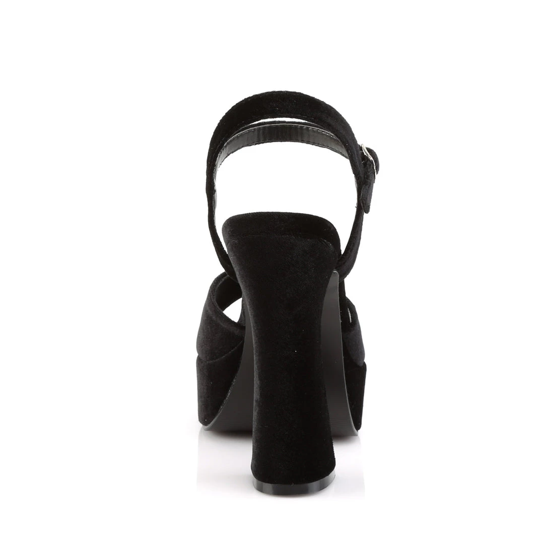 A combination of soft material with comfortable design, these black velvet platform heels include a 5″ (127mm) Chunky Heel, 1 3/8″ (35mm) Platform Ankle Strap Sandal