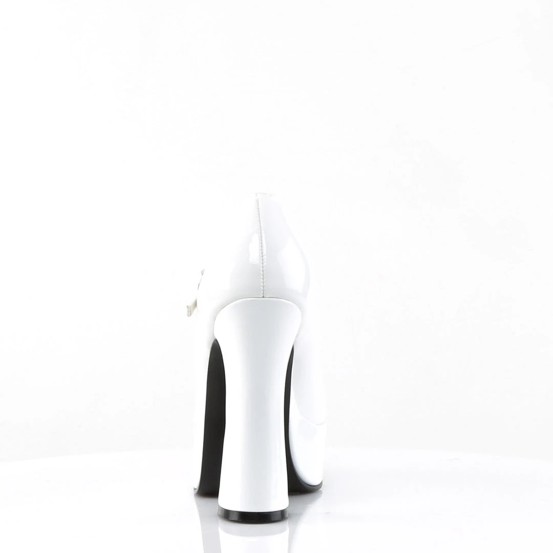 5″ (12.7cm) Heel, 1 1/2″ (3.8cm) Platform Mary Jane white patent leather pumps
