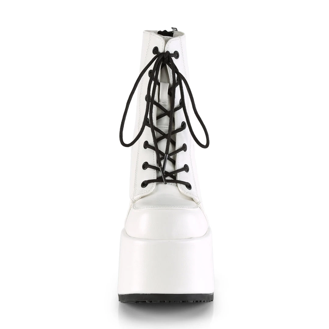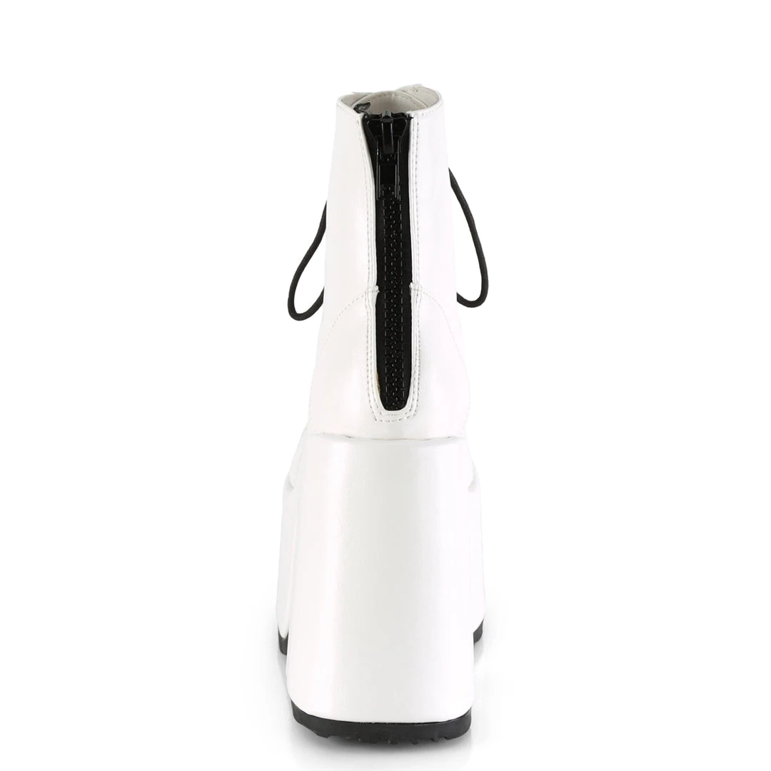 Bold urban street wear fashion invites these white platform boots with a 5″ (127mm) Chunky Heel, 3″ (76mm) Platform Lace-Up Ankle Boots and Back Metal Zip Closure.