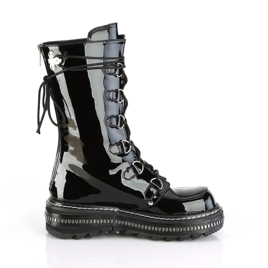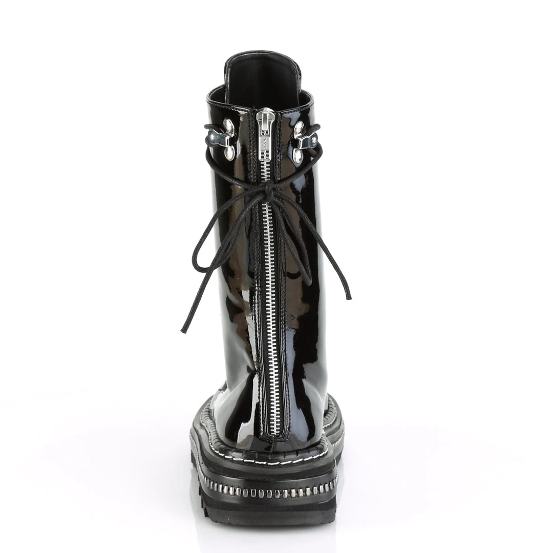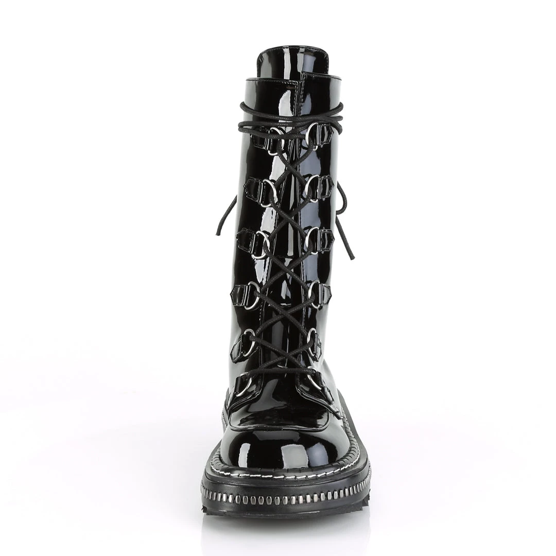 1 1/4″ (32mm) Metal Trimmed Platform D-Ring Lace-Up Mid-Calf Boot, Back Zip Closure
