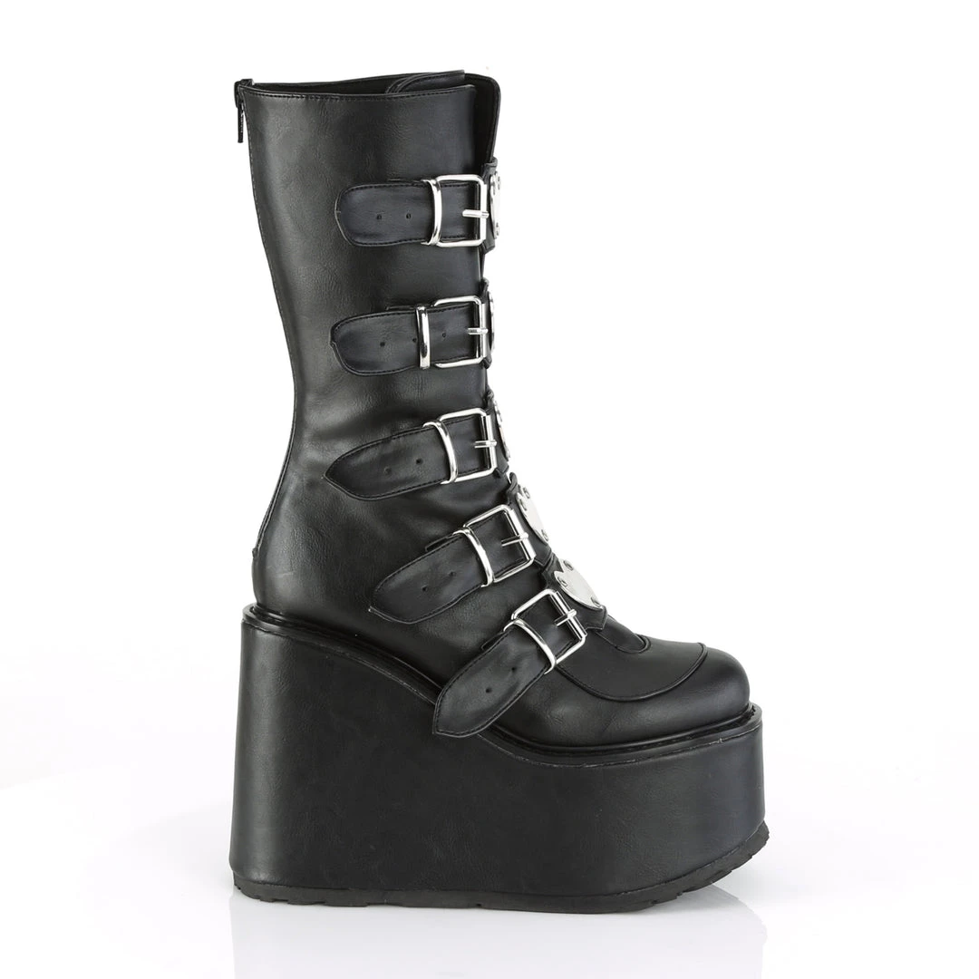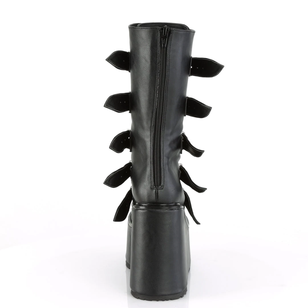5 1/2″ (140mm) Platform Mid-Calf Boot Featuring 5 Buckle Straps with Heart Shaped Metal Plates at Center, Back Metal Zip Closure