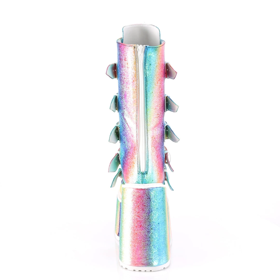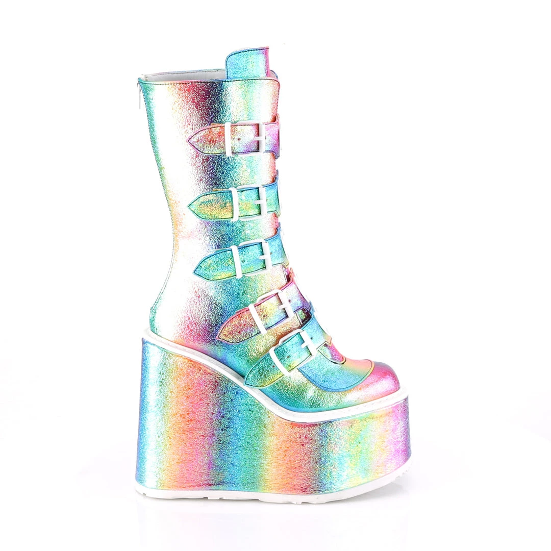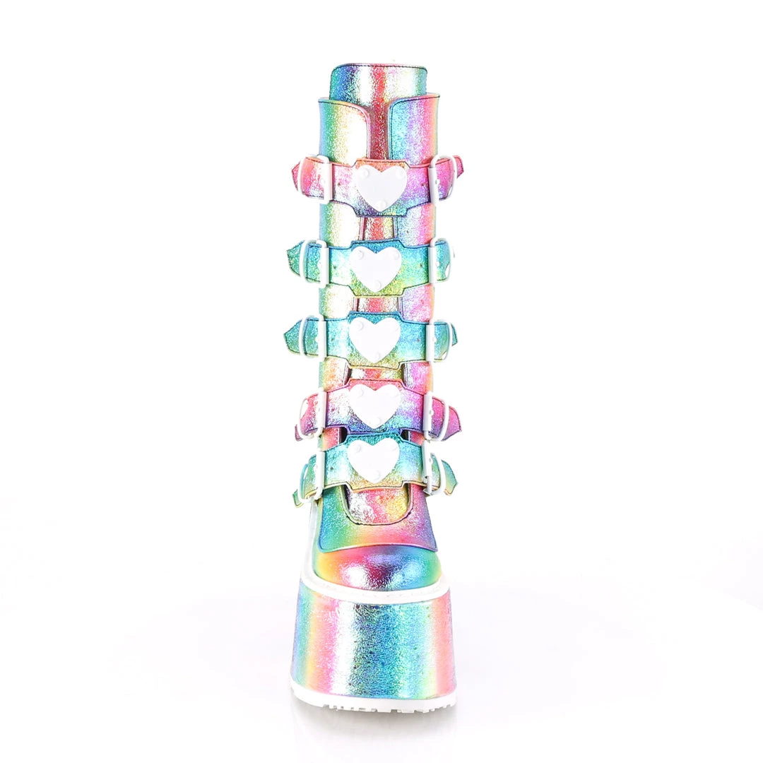 5 1/2″ (140mm) Platform Mid-Calf Boot Featuring 5 Buckle Straps with Heart Shaped Metal Plates at Center, Back Metal Zip Closure
