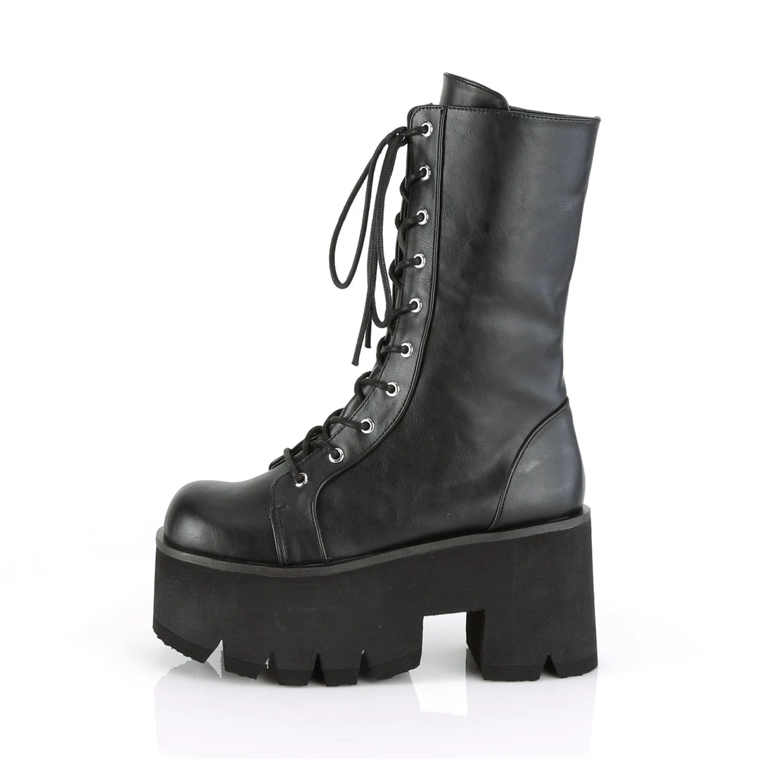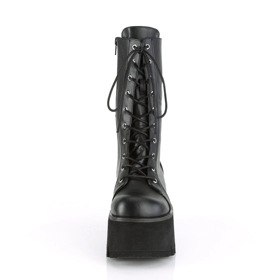 Be on trend with these 3 1/2″ (90mm) Chunky Heel, 2 1/4″ Platform Lace/Up Mid/Calf Boots with side zippers.