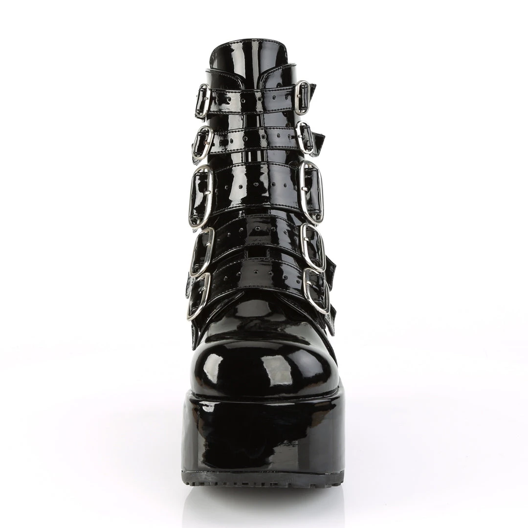 Bold urban verago invites these black patent leather platform boots with a 4 1/4″ (108mm) Platform with Multi Buckle Straps, Back Metal Zip Closure.