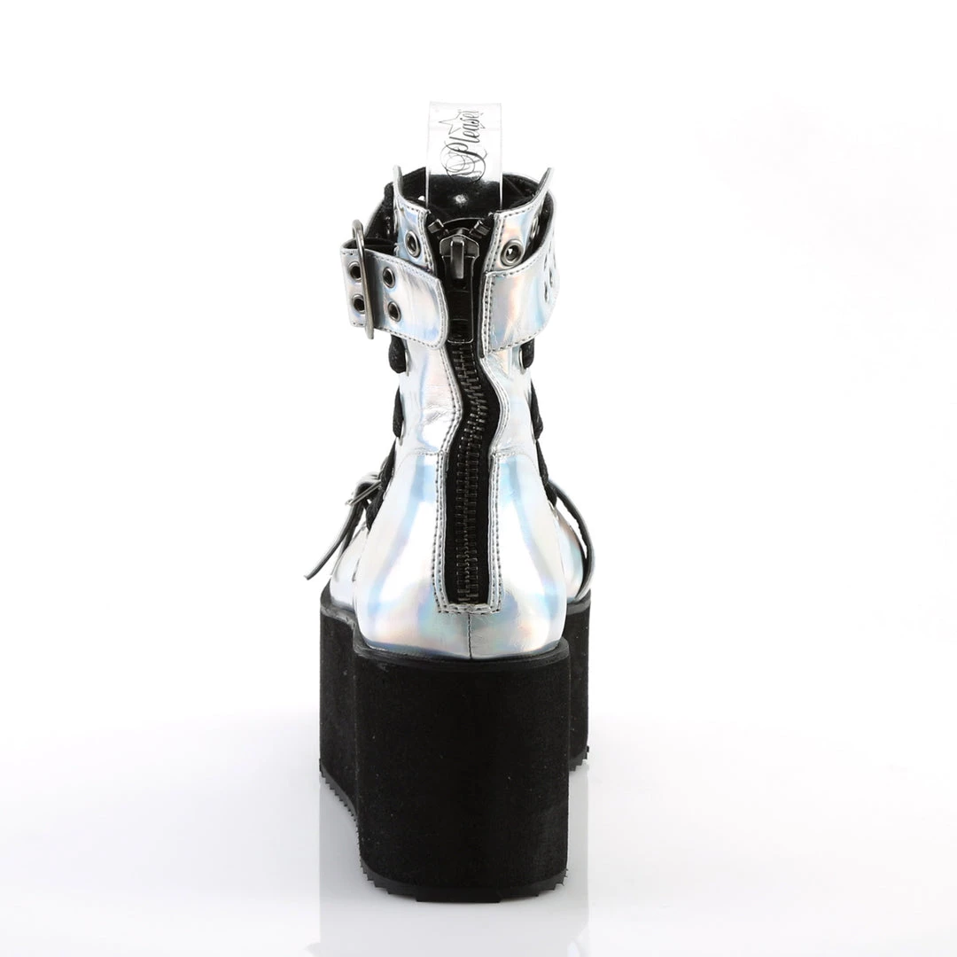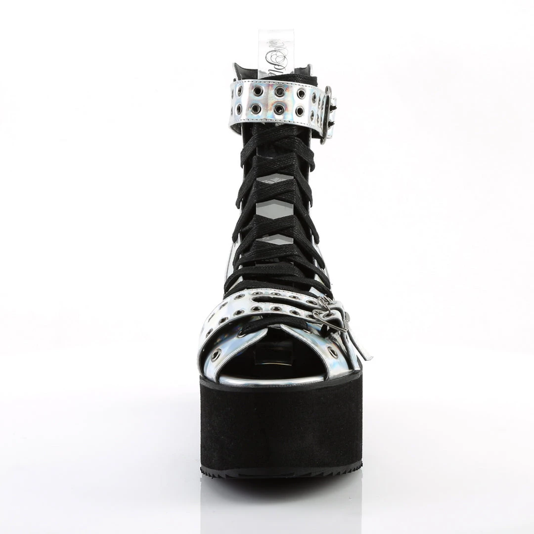 2 3/4″ (70mm) Platform Lace-Up Ankle High Sandal with Eyelet Covered, Buckle Straps Across Toe and Ankle, Metal Back Zip Closure