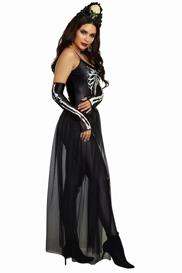 - Includes: Skeleton-print top with attached full length sheer open-front skirt