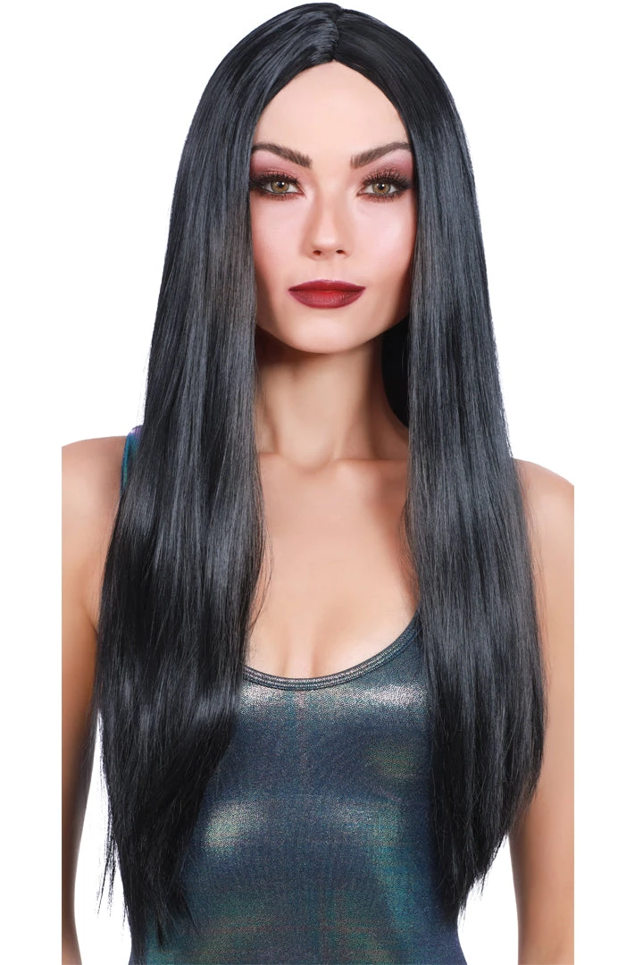 This Long Straight Jet-Black Wig is mysterious for modern-day wear or hauntingly gorgeous for a spooky look! This one piece black wig includes adjustable straps for a secure hold. Not only does this long layered wig come ready to wear, but it features a human-like and easy to maintain look.
