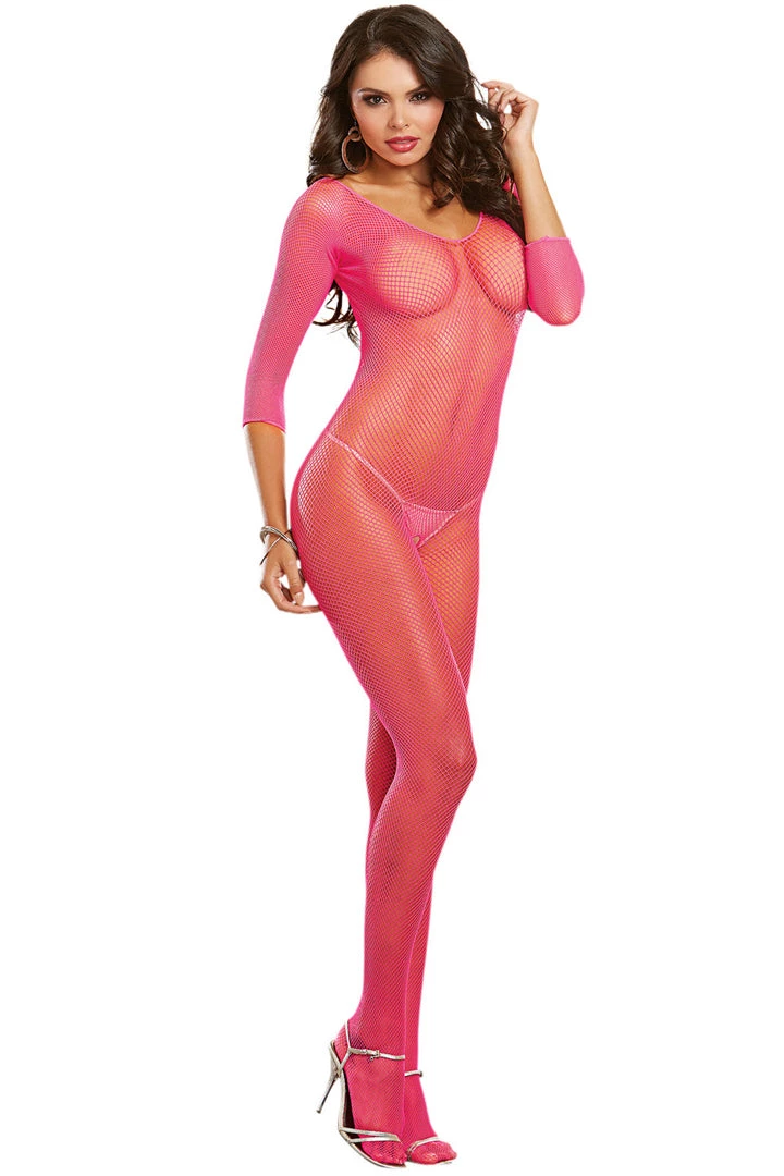 Electrifyingly sexy, this Neon Pink Fishnet Open Crotch Bodystocking combines effortless with sophistication. Includes a one piece full crotchless bodystocking with long sleeves, scoop neckline, and closed toe leggings. *G-string panty not included.