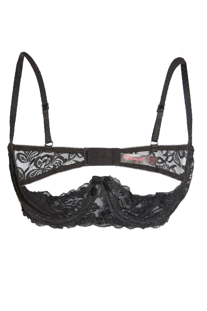 Look divine in this Black Sultry Nights Open Cup Shelf Bra that features a beautifully made open cup lace shelf bra with underwire cups, front bow detail, adjustable shoulder straps, and hook-and-eye back closure. *Shelf bra only. Nipple pasties not included.