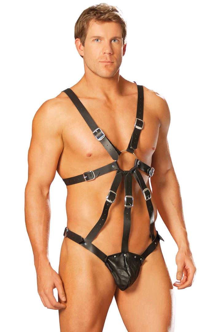 Take your look to an erotic height with this Men’s Leather Harness with Pouch that features a 100% genuine leather men’s bdsm harness with o-rings and an attached pouch.