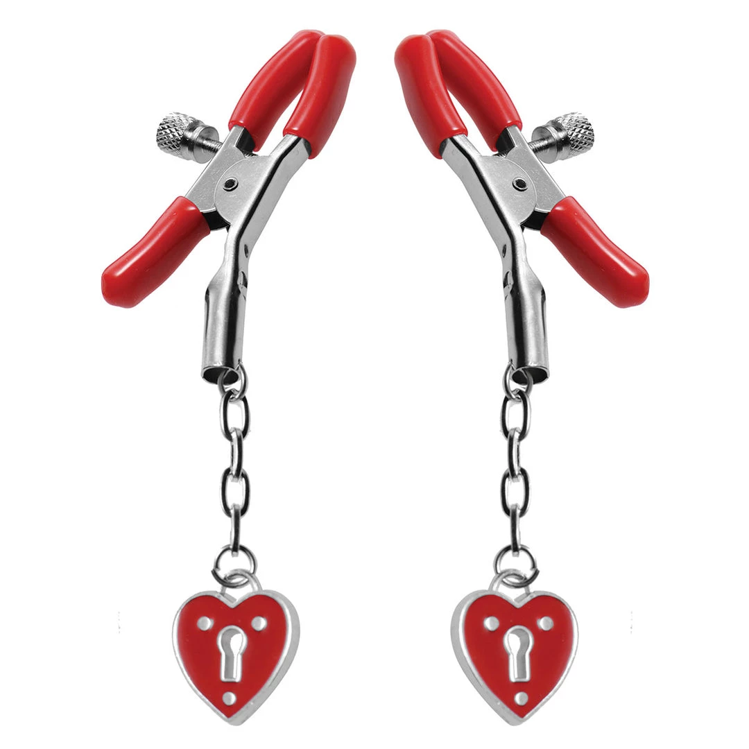 These easy-to-use clamps have a simple screw-down design, accented with a heart shaped padlock. The vinyl coated tips allow for a comfortable and secure grip while the black lacquered heart accent dangles enticingly from the end. The screws on the sides allow for pressure control.