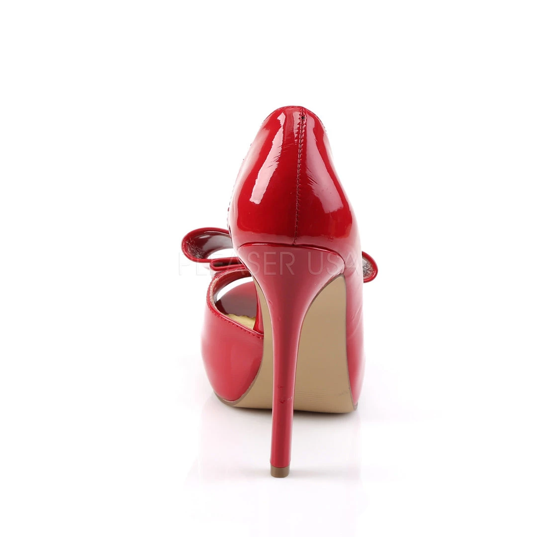The perfect party heels, these red patent leather pumps include a 4 3/4″ Heel with 1″ Platform Peep Toe d’Orsay Pump with top bow.