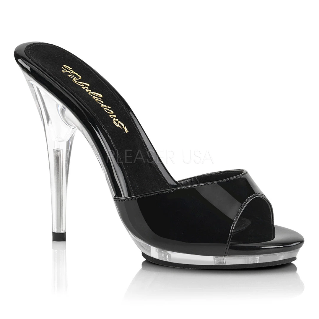 Flirtatious and sensual appeal, these clear heels include a 5″ Heel with 3/8″ Platform Slide.