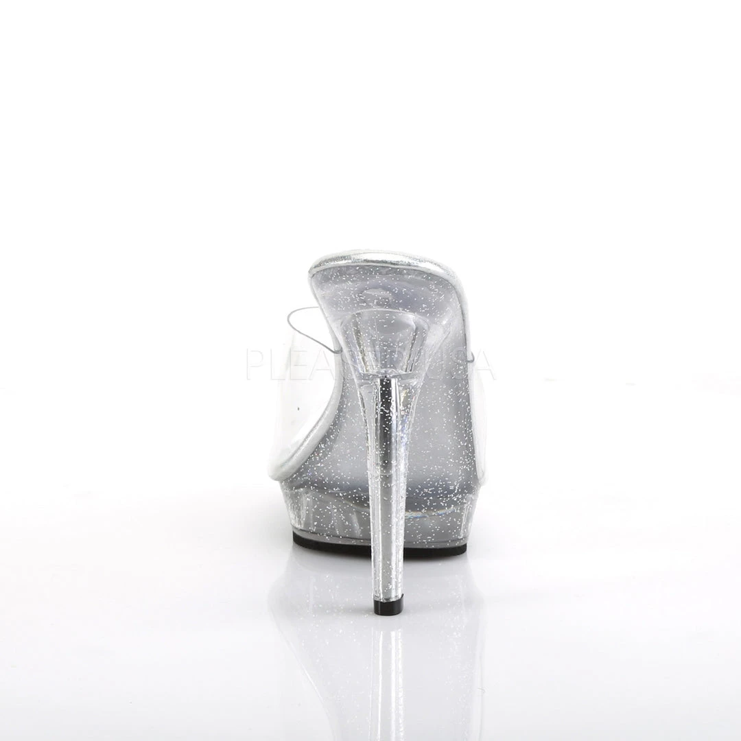 Casual comfort combined with flirty femininity, these clear 5″ heels include 3/4″ Platform Slides with mini glitters.