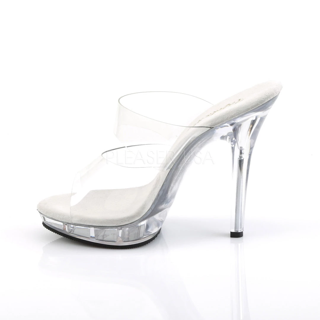 Slip into clear bliss with these clear 5″ heels with 3/4″ Platform Two Band Slides