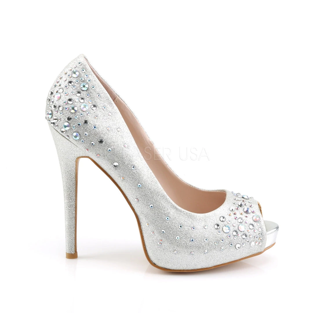 Sparkle bright in these silver 5″ Heel, 3/4″ Hidden Platform Peep Toe Pump that shimmer
