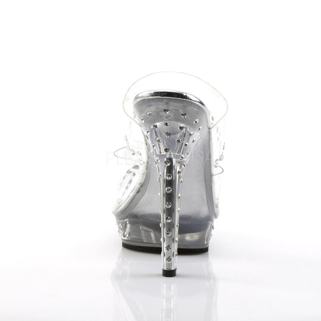 Combine comfort with fashion in these clear 5″ heels that include 3/4″ Platform Two Band Slides