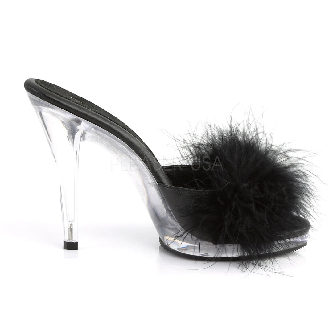 Flirtatious femininity, these 4 1/2″ Heels include 1/2″ Platform with slide on marabou feather tops.