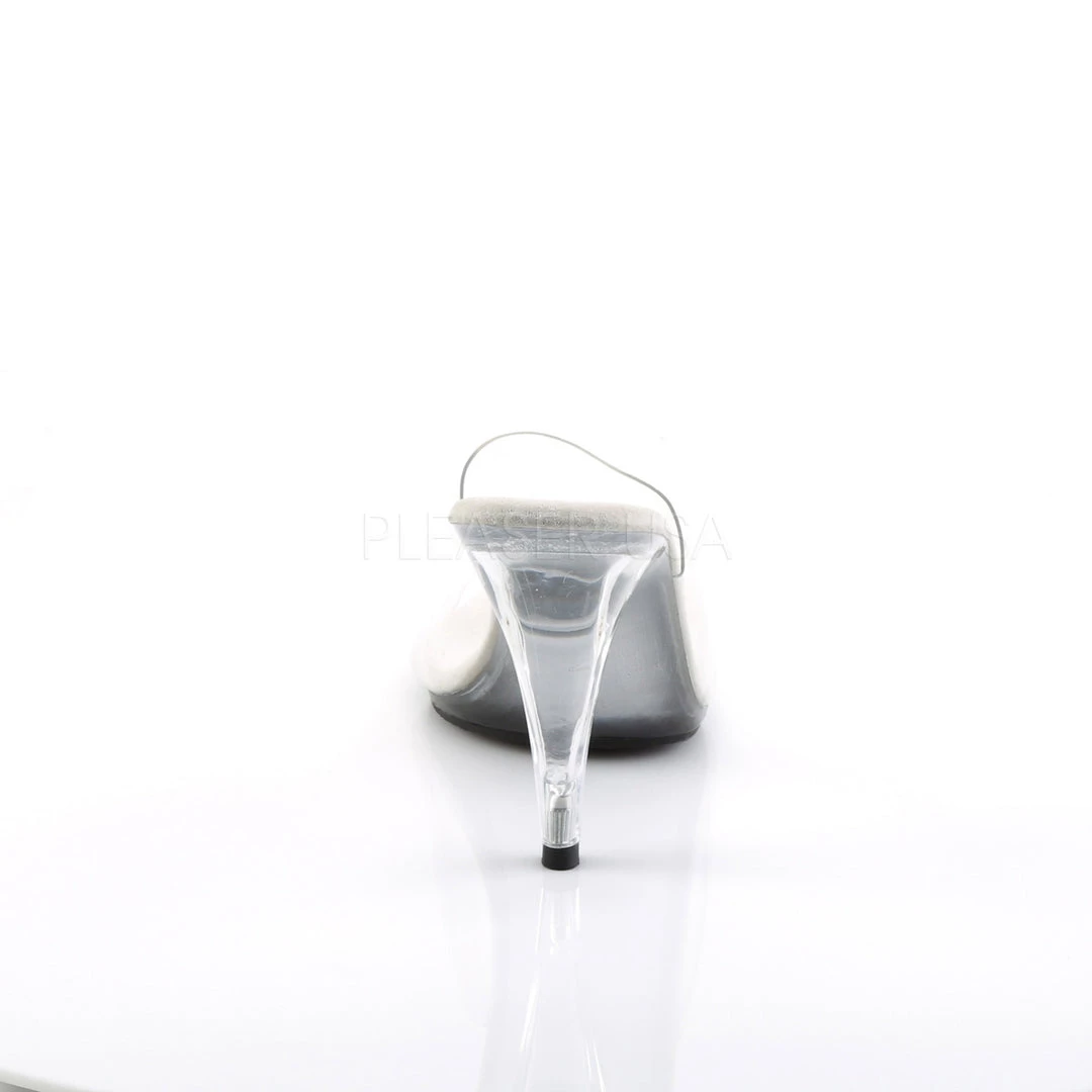 Elegant and classy, these 4″ Heel, 1/8″ Platform Slides feature clear peep toe tops with slide on heels.
