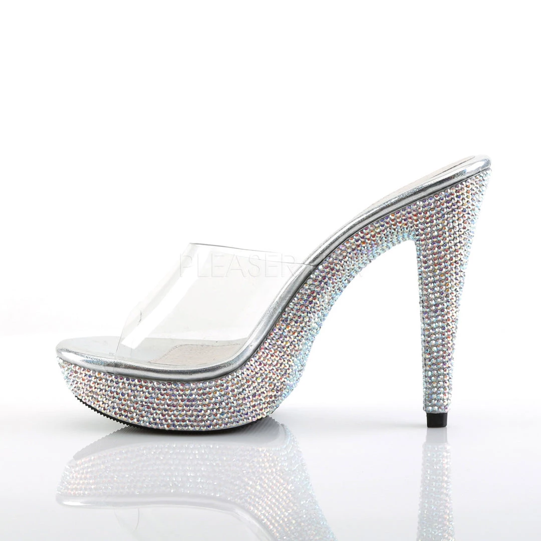 Sparkle with each step in these 5″ Heels with a 1″ Platform Slide and silver glitter bottoms.