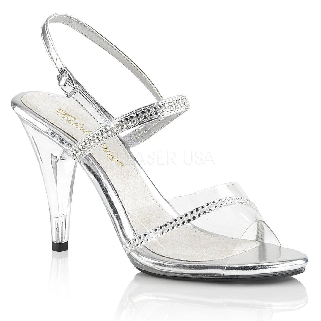 Sparkle bright in these 4″ Heel, 1/8″ Platform Sling Back Sandals that feature peep toe tops with ankle straps.