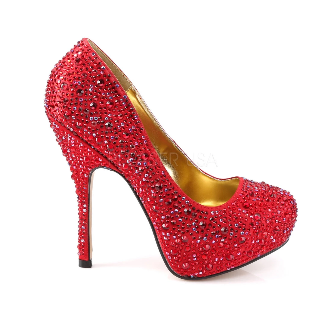 Click your heels three times and dance in these red 5 1/4″ Heels with 1 1/4″ Hidden Platform Pump with mid-sized rhinestones.