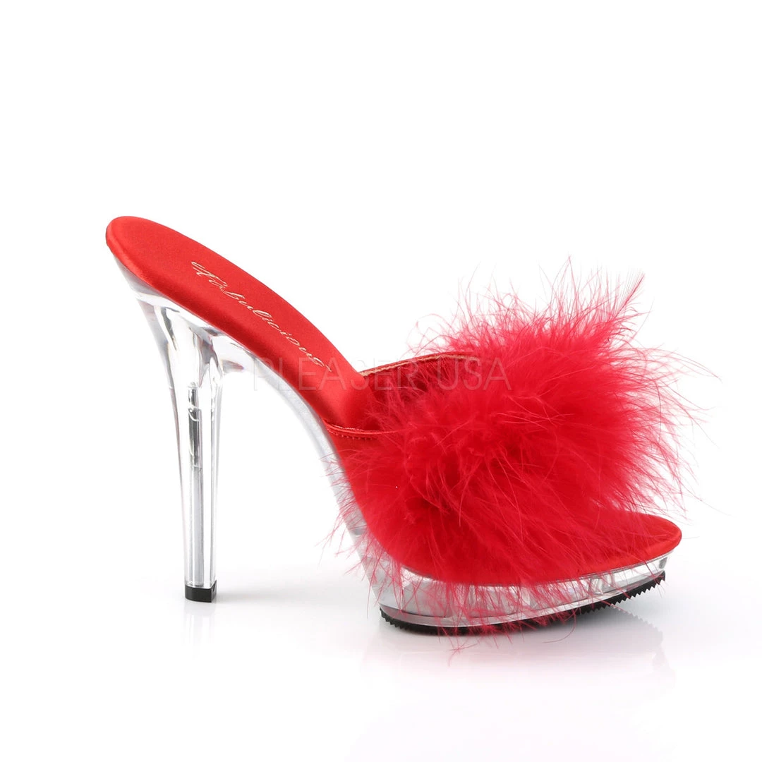 Kick up your heels with these fiery red 5″ clear heels with 3/4″ Platform Red Marabou Slippers