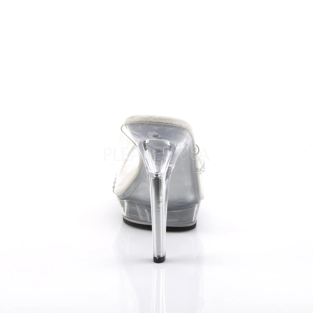 Subtle elegance, these clear 5″ heels include 3/4″ Platform Slides with Rhinestone bands.
