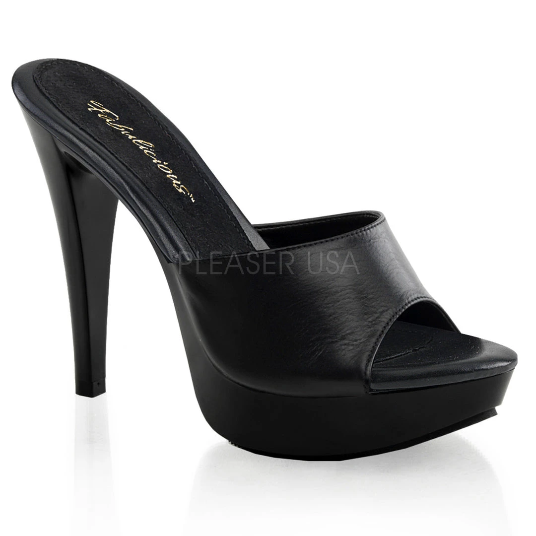 Effortless attraction, these black 5″ Heels include a 1″ Platform Slide in faux leather.