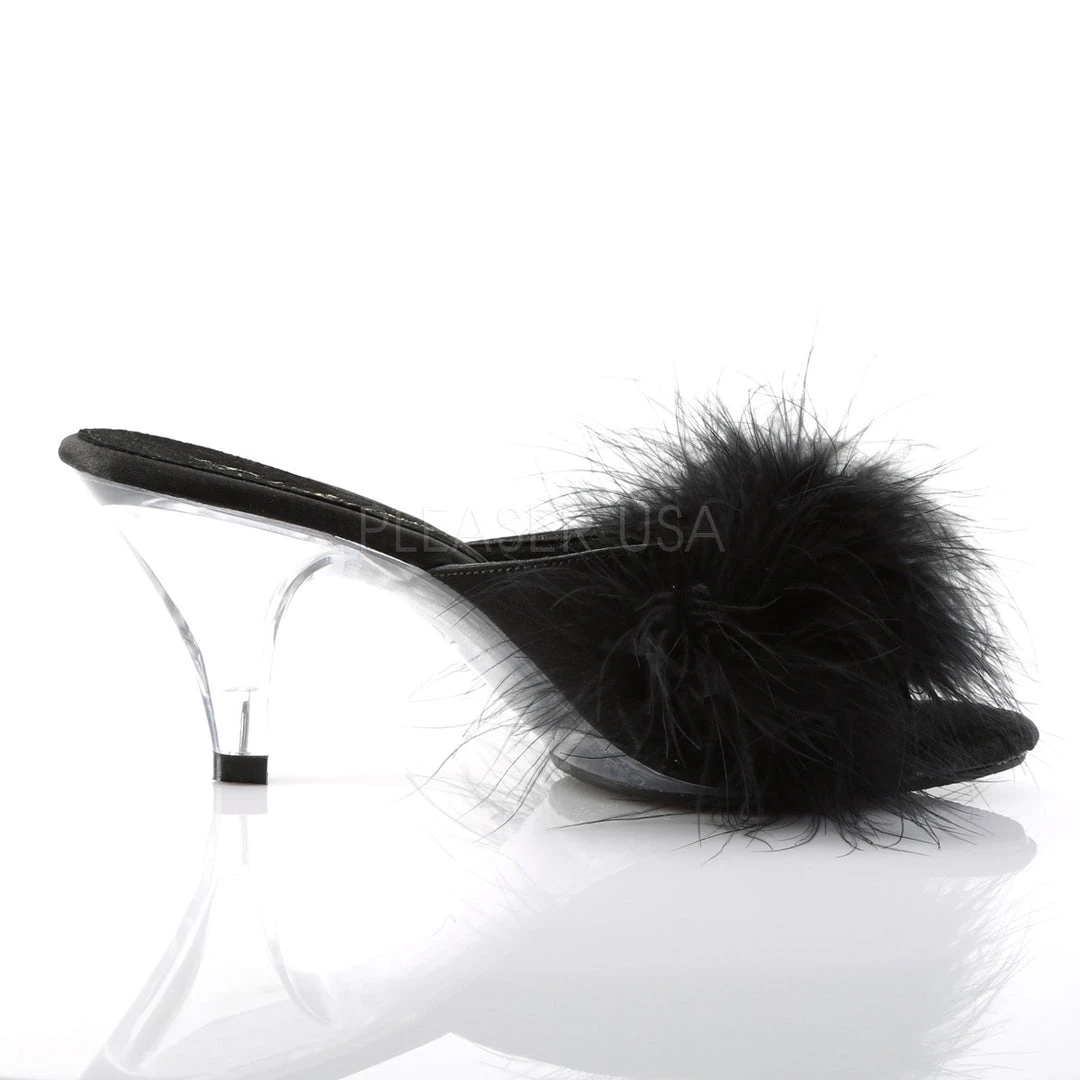 Classic femininity, these black 3″ Heel Fur Sandal feature small clear heels with faux fur.