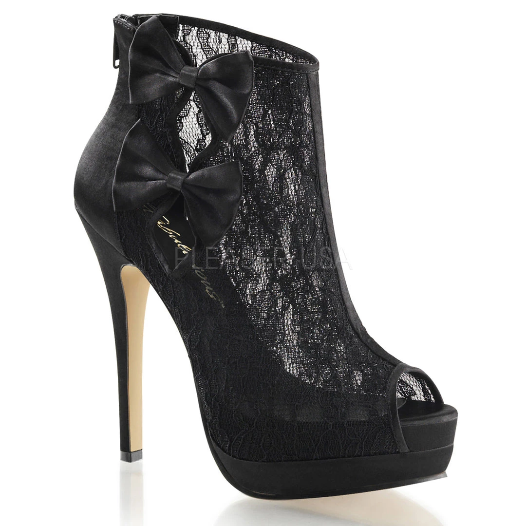 Look and feel fabulous in these 5 1/4″ Heel, 1 1/2″ Platform Peep Toe Booties with sheer lace overlay, satin bows, and back zippers.