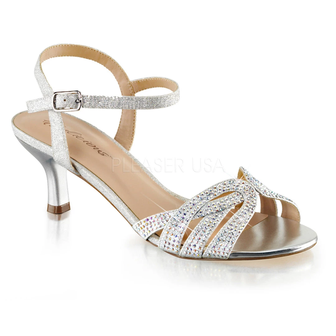 Sparkle in these 2 1/2″ Kitten Heel, Ankle Strap Criss-Cross Sandals