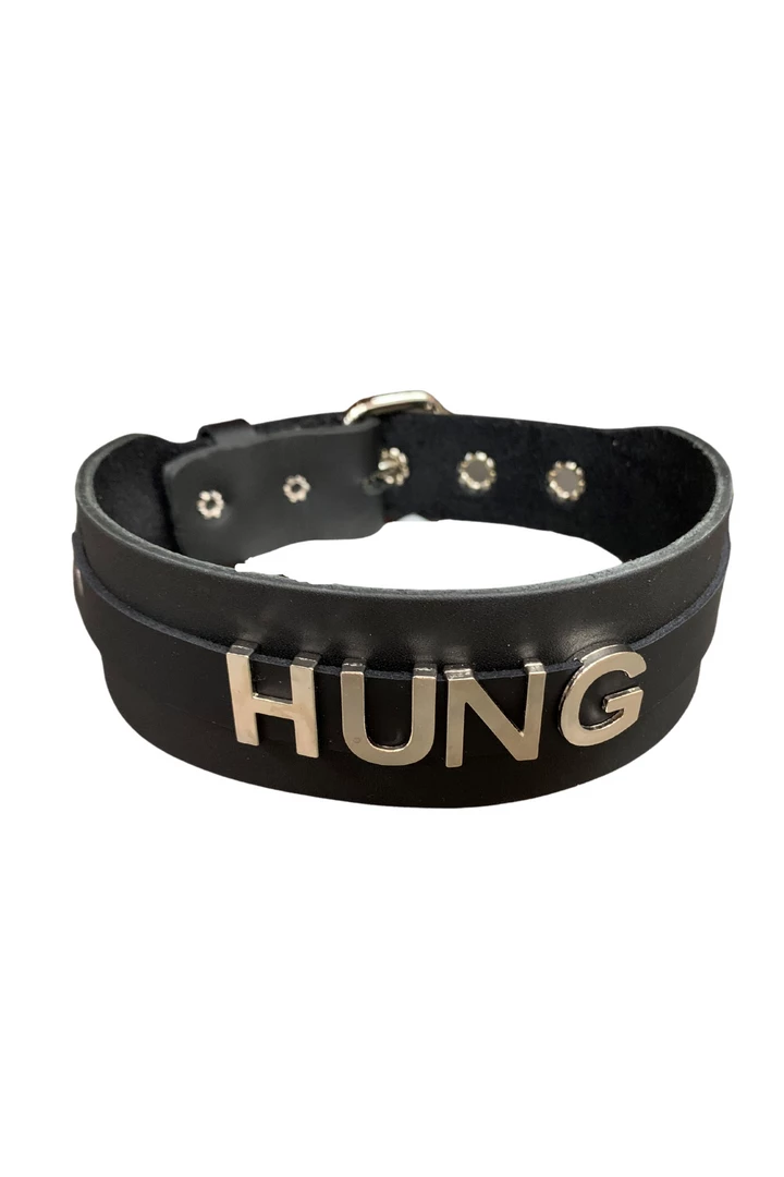This 1 3/4″ Leather Strap ‘HUNG’ Name Choker features a unisex choker with 100% premium leather, 1 3/4″ inch choker, with large metal letters that spell ‘HUNG’. The fantasy of every deviant’s dreams, wear this BDSM choker that holds fetish meaning.