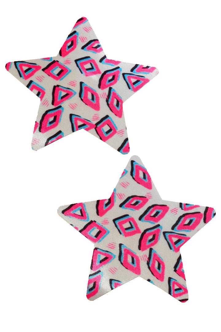 White star nipple pasties with hot pink and blue diamond print. Feature self adhesive tape, just peel and stick on clean, dry, oil-free skin.