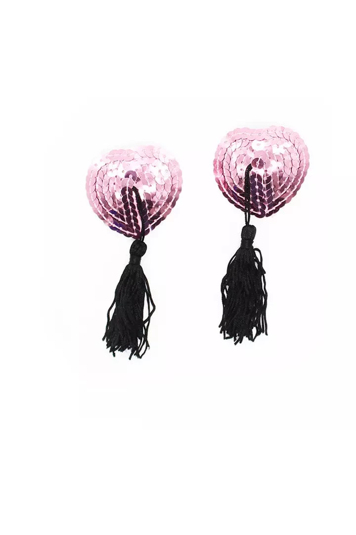 Express your love with these Pink Sequin & Black Tassel Nipple Pasties that feature cone-shaped nipple pasties with light pink sequins and black dangling tassels. Features removable plastic backing – just peel-and-stick on clean dry skin!