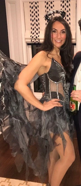 It feels so good to be so bad in this Deluxe Dark Angel’s Desire women’s deluxe angel costume. This dark angel costume features a beautiful grey satin shimmer bodice, organza and chiffon dress with embroidered sheer bodice, dramatic full wings with draped chiffon, and halo.